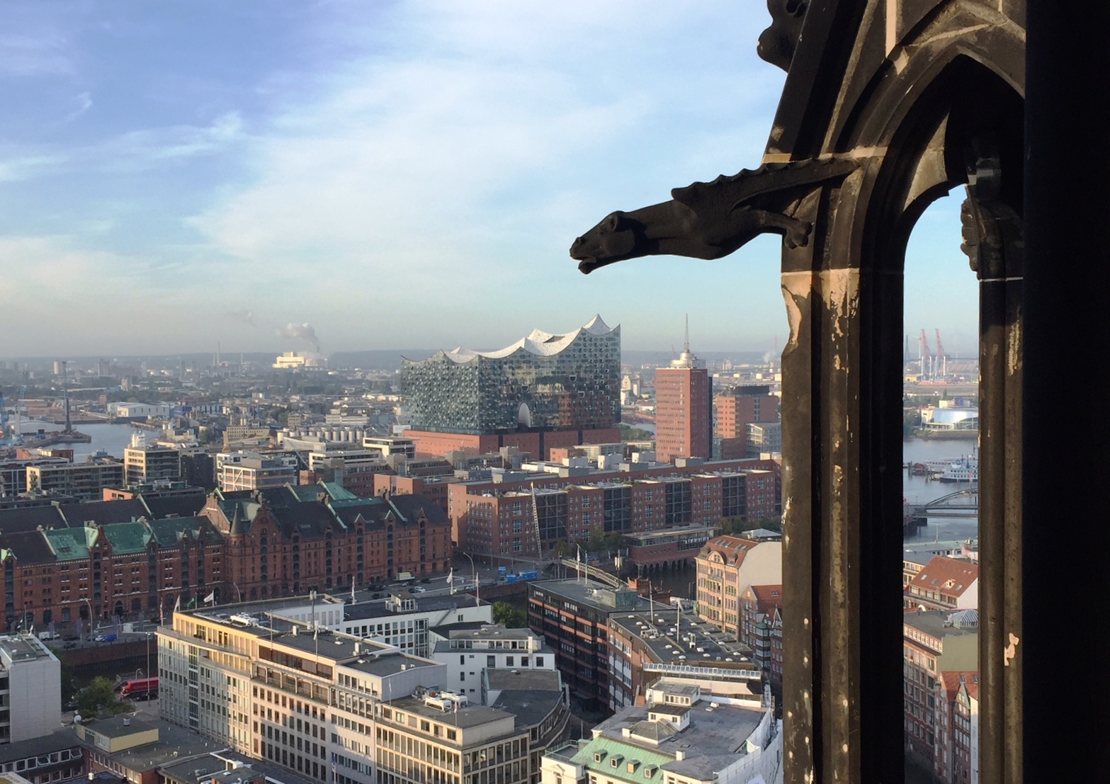 Während der Luftangriffe auf Hamburg diente der damals wie heute höchste Kirchturm der Stadt den alliierten Bomberpiloten als Orientierung. Heute bringt ein gläserner Panoramalift die Besucherinnen und Besucher zu einer Aussichtsplattform in 76 Meter Höhe. Von dort eröffnet sich ein eindrucksvoller Blick über die Innenstadt mit der Alster und den Hafen mit der Elbphilharmonie. Fotoaufnahmen von 1943 stellen dem heutigen Ausblick Ansichten der durch die Bombenangriffe zerstörten Stadt gegenüber.