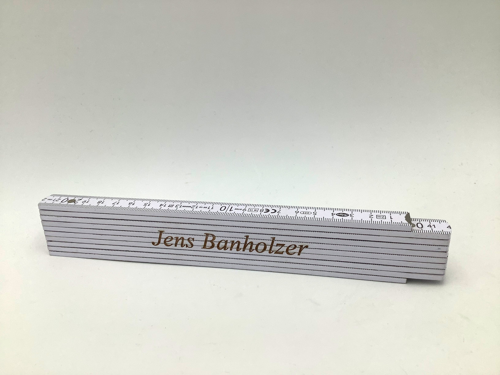 Für alle Besitzer der AzubiCard bieten wir einen Meterstab mit individueller Gravur auf der Vorder- und Rückseite an. So können beispielsweise der Name des Besitzers und das Unternehmenslogo des Ausbildungsbetriebs jeden Meterstab zu einem Unikat werden lassen. Der Meterstab besteht aus Holz und verfügt über eine Einrastfunktion. Die Gesamtlänge des Meterstabes beträgt 2 m. Der Normalpreis beträgt 8,- (brutto) €. Mit der AzubiCard können wir Dir einen individuell gestalteten Begleiter für den Arbeitsalltag zum Angebotspreis von 6,50 (brutto) € anbieten.