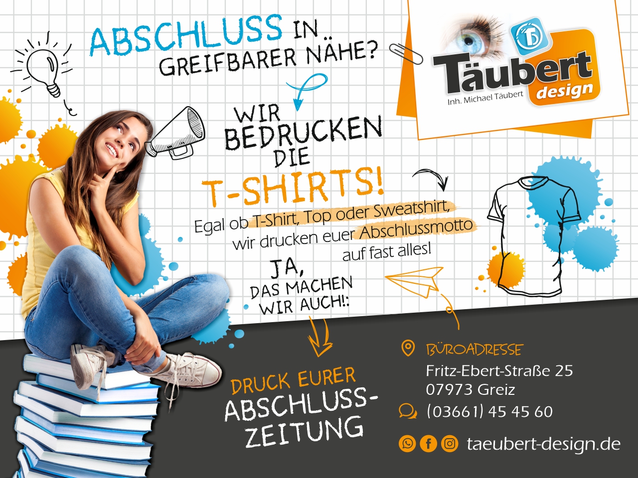 Der Abschluss rückt näher und ihr wollt diesen Meilenstein gebührend feiern? Dann haben wir genau das Richtige für euch: Abschluss-Shirts: 1-seitig mit Abschlussmotto bedruckt — 1-farbig – 28,00 € brutto | mehrfarbig – 33,00 € brutto 2-seitig mit Abschlussmotto und Namensliste bedruckt — 1-farbig – 33,00 € brutto | mehrfarbig...
