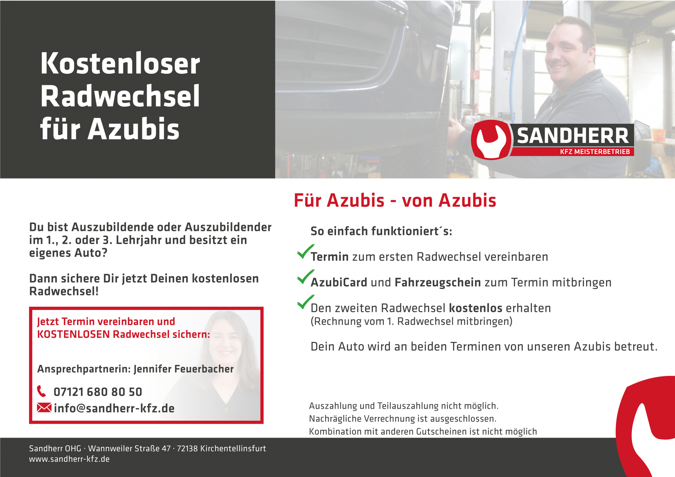 Sichere Dir während Deiner Ausbildung Deinen kostenlosen Radwechsel. Du zahlst nur den ersten Radwechsel und bekommst den zweiten umsonst. Alle Infos findest Du anbei.