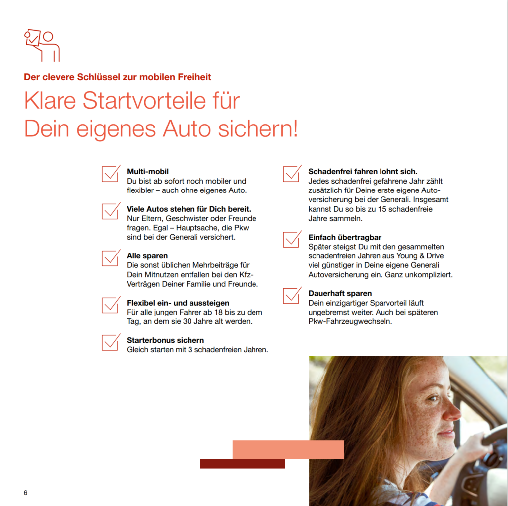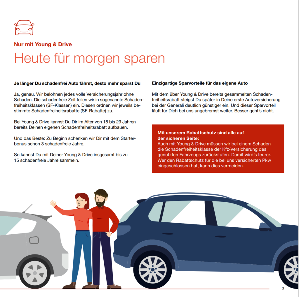 Für junge Menschen ist es ohne Hilfe der Eltern kaum möglich, günstig sein eigenes Auto zu versichern. Deswegen haben wir für junge Fahrer und Azubis ein Young & Drive Ticket. Damit zahlen künftige Ticket-Inhaber:in einen unschlagbaren niedrigen Preis. Das Beste ist noch, dass wir eine Schadensfreiheitsklasse vergeben, die sonst ein langjähriger Fahrer hat und keine Verschlechterung der Einstufung gibt, falls es zu einem selbst verschuldeten Unfall kommen sollte 🙂