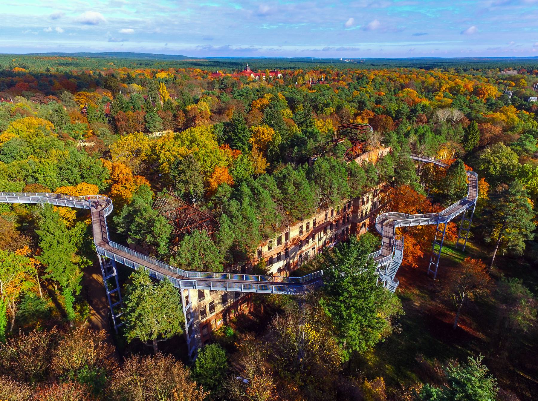 Dort, wo sich heute ein Baumkronenpfad durch die Wipfel alter Bäume und über die Weltkriegsruine des „Alpenhauses“ schlängelt, entstanden vor über 100 Jahren die heute noch berühmten Beelitzer Heilstätten. Hier sollte sich die Arbeiter aus Berlin – inmitten von Wäldern, umgeben von hochwertiger Architektur und großzügigen Wald-Parkanlagen – von der damals grassierenden Tuberkulose erholen. In beiden Weltkriegen dienten die Heilstätten als Lazarette für deutsche Soldaten. Von 1945 bis 1994 waren sie das größte Krankenhaus der „Roten Armee“ außerhalb des Mutterlandes. Nach dem Abzug der Sowjetarmee fielen zahlreiche, bis dahin in Nutzung stehende Gebäude Kupferdieben und andere Zerstörungswütigen zum Opfer. Heute strahlen diese Gebäude trotz – oder auch wegen – eines romantischen Wildpflanzenbewuchses einen morbiden Charme aus, der an schlafende Schlösser erinnert. Vom 40 Meter hohen Aussichtsturm bieten sich einzigartige Ein- und Ausblicke in das Heilstättengelände, in den Fläming und bis nach Berlin.